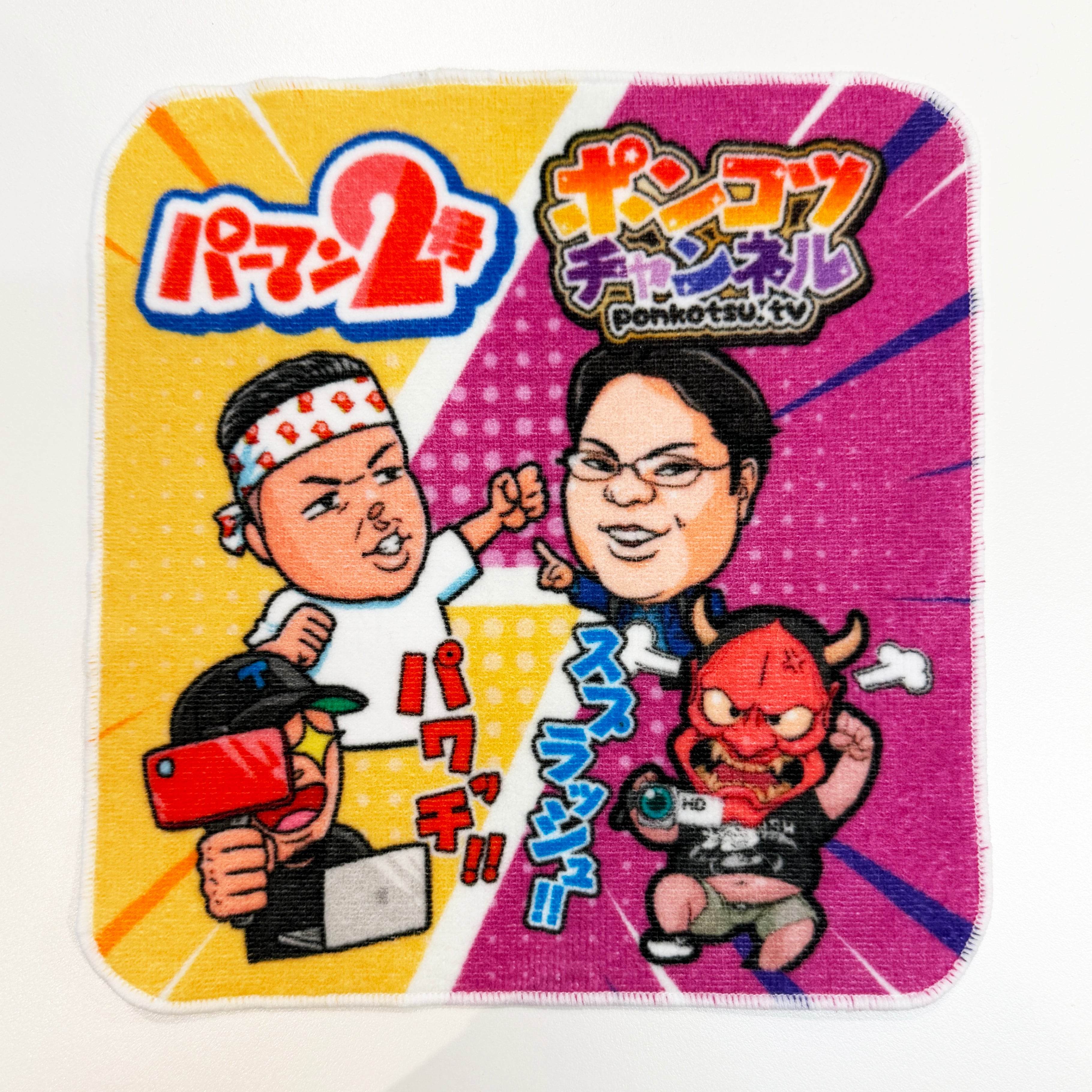 パーマン2号chとポンコツチャンネルのイラストがプリントされたオリジナルハンカチになります。